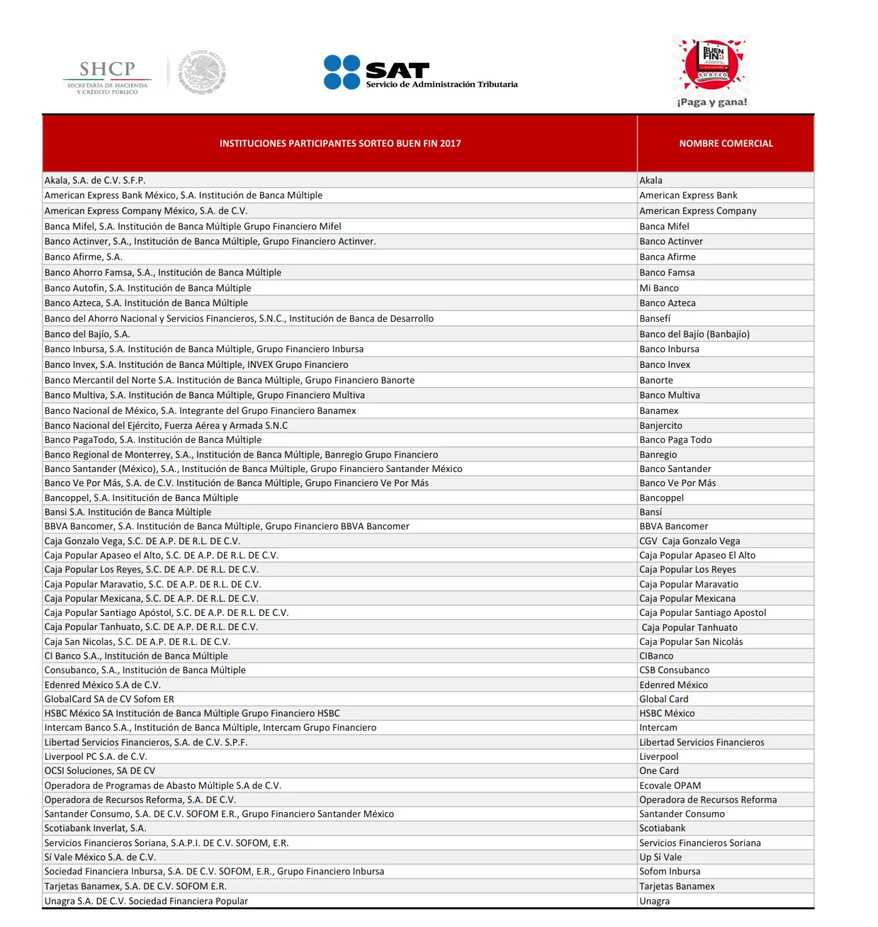 A continuación detallamos las entidades y tarjetas que participan de la Lotería Fiscal del Buen Fin: