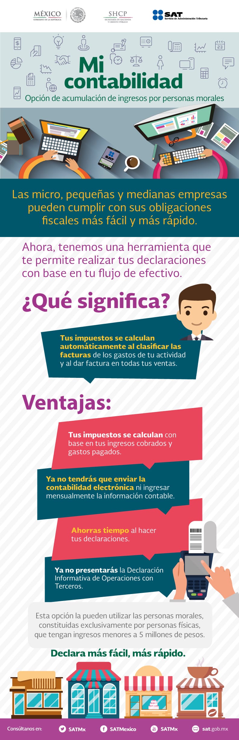 El SAT lanza el sistema “Mi Contabilidad” para los contribuyentes que hayan seleccionado la opción de acumulación de ingresos por personas morales. Está enfocado a personas físicas con actividades empresariales, profesionales y arrendamiento.