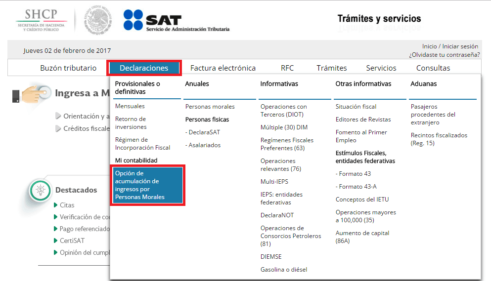 - Empresas que generan menos 5 millones de pesos en la declaración anual del ejercicio fiscal 2016. Para el caso de las personas morales que inicien operaciones o reanuden actividades a partir del ejercicio fiscal de 2017, presentar la opción de tributación dentro del mes siguiente a aquel en que presenten los mencionados avisos (a más tardar el 10 de marzo)